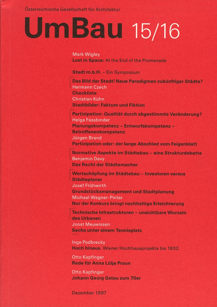Kurz vor Jahresende liegt nunmehr die Doppelnummer UmBau 15/16 vor, an deren Umfang der zeitliche Abstand zur letzten Ausgabe sichtbar wird. Schwerpunkt dieses Heftes ist der urbane Raum, seine Definition und Handhabung sowohl in der Planung, im theoretischen Diskurs als auch im täglichen Gebrauch. Stadt und Stadtentwicklung sind nach jahrzehntelanger Vernachlässigung wieder und immer mehr ein Thema öffentlichen Interesses. Dies bestätigen auch die zahlreichen Veranstaltungen verschiedener kultureller sowie politischer Institutionen.