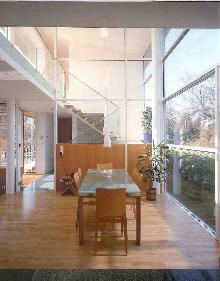 und Faserzementplattenverkleidung. Nur die zum Gartenhof gelegene Außenwand mit dem größten Glasanteil blieb in Leichtbauweise.