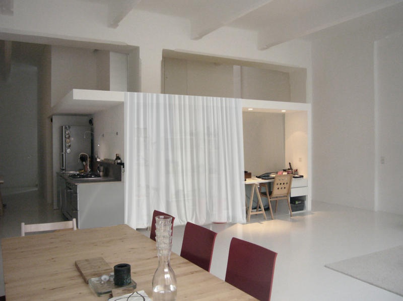 Eine im 4. Stock befindliche Einheit von 70 qm mit 6 qm Balkon beherbergt das Fotostudio ZG61, das sowohl als Arbeitsplatz wie später auch als Loftwohnung seine Verwendung finden können sollte, beide Adaptierungen sollten für beide Varianten vorhanden sein. Aufgrund der geringen Grundfläche baute man in den bestehenden Raum einen Kubus, der wiederum eine zusätzliche Fläche von 15 qm ergab. Darunter befindet sich der Nassraum (Bad WC) und Abstellraum. Oberhalb dieses Würfels, das Büro oder später das Schlafzimmer. Auch sollte das Loft beim Wohnen bzw. Arbeiten spürbar und erkennbar bleiben, alte Strukturen also erhalten werden. Daher wurde versucht, mit bestehenden Materialen zu arbeiten (Stahlträger, Radiatoren, Stiege,.......), sprich eine Verbindung von alt und neu zu schaffen um typisches Loftwohnen möglich zu machen.