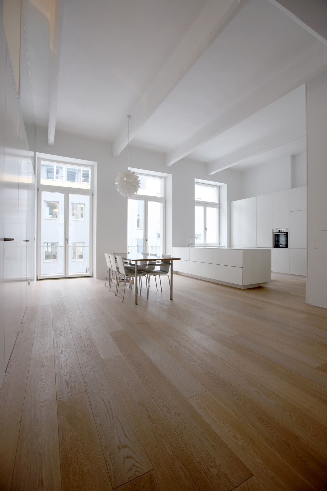 Die zentrale Entwurfsidee für die Wohnung ZG61 ist der Erhalt der Dimension und Großzügigkeit im Wohnbereich, welcher sich mit Fensterfronten zu jeweils beiden Innenhöfen öffnet, ohne Kompromisse in der Privatsphäre der funktionellen Räume und Schlafzimmer eingehen zu müssen. Tageslicht strömt durch die großen Oberlichten der präzise gesetzten Möbelwand auch in die weiter von den Fenstern entfernten Bereiche. Besondere Aufmerksamkeit richtet sich auf die Textur der konstruktiven Einzelheiten. Es wurden nur wenige Materialien eingesetzt und auch die Oberflächen sind sorgfältig gewählt.