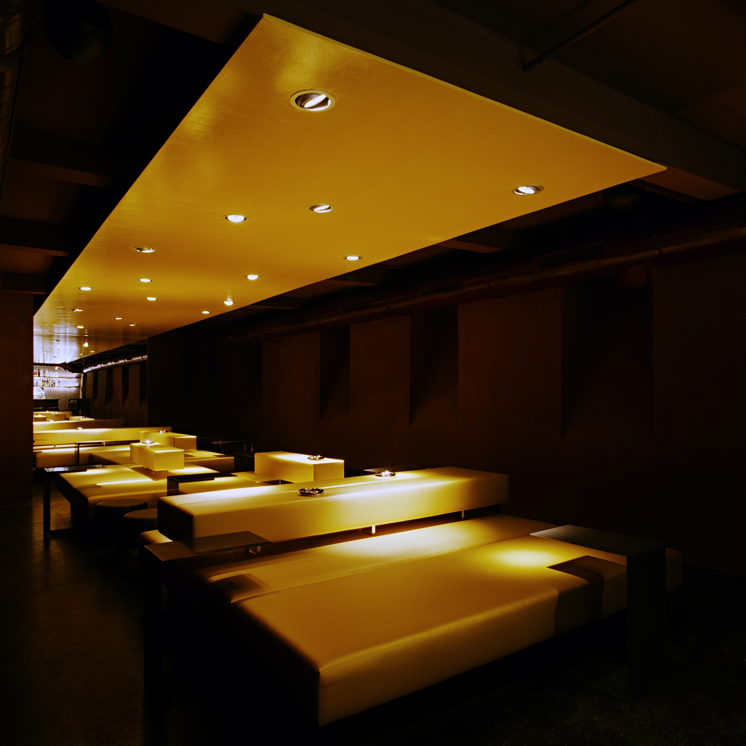 Im ehemalig chinesischen Karaokekeller wurde nun von SUE Architekten „der Goldfinger“ – die Bar im „schon schön“ implantiert. Im Hauptraum dominiert einzig und allein das golden leuchtende Sitzteil. Es kann flexibel angeordnet werden und funktioniert somit im schummrigen Barbetrieb genauso wie für Tanz und DJ-Abende. Das Thema des Obergeschosses – gemeinsam Tafeln an einem einzigen Tisch – wird in der Bar weiter gespielt. Das Sitzteil mäandriert im Raum. Dadurch entstehen kommunikative und intime Bereiche. Der Praxistest zeigt, dass die beiden Sehnsüchte - intimes Gespräch und das Knüpfen von Kontakten – mit dieser Aufstellung ausgezeichnet funktioniert. Und dann gab es noch den Wunsch der Barbetreiber nach einem verrauchten „Mafiazimmer“. Das feudale Extrazimmer - „die Schnecke“ - gibt der Bar einen würdigen Rückzugsraum. Hier kann man dekadent per Tastendruck nach der nächsten Flasche Champagner rufen. Anders als im Hauptraum des Erdgeschosses wird in der Bar nicht mit Effekt gegeizt. Bei der Floralbespannung darf durchaus an Wiener Bars der Jahrhundertwende gedacht werden. Die gold changierende Stoffbespannung gibt den drei Freunden die lange ersehnte Opulenz.