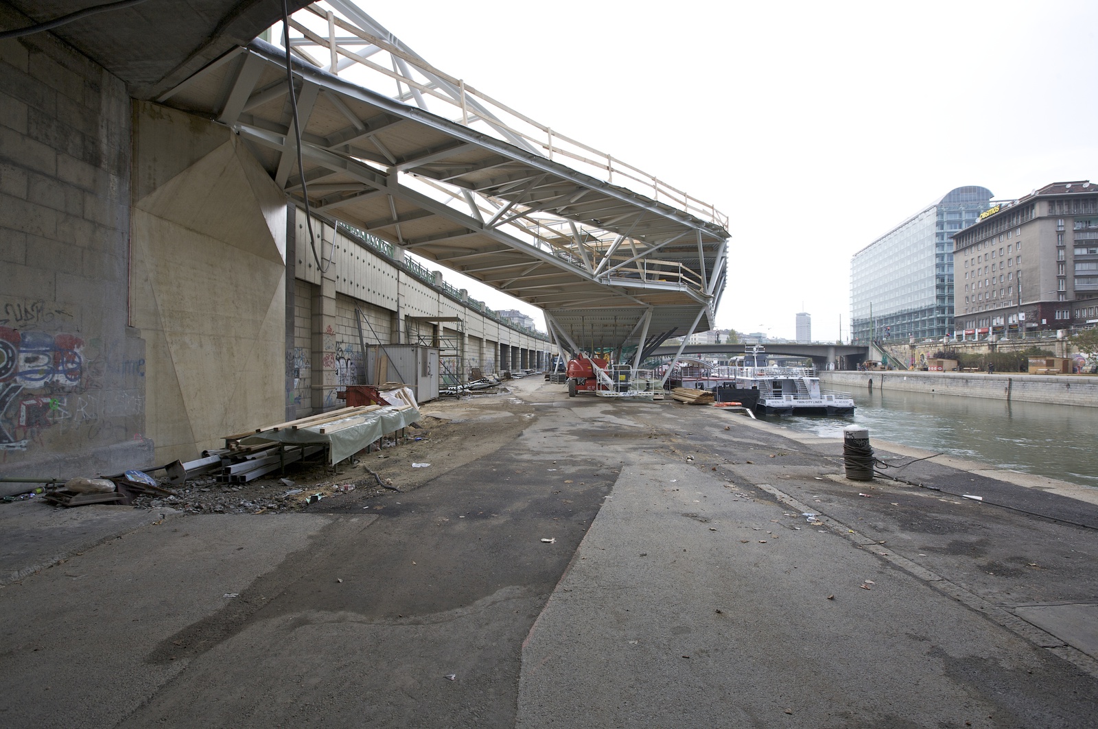 Schräg gegenüber, am anderen Ufer des Kanals, geht ein weiteres ungewöhnliches Bauwerk vor Anker, das bereits in der Entstehungsphase für Rauschen im Blätterwald gesorgt hat: Die Schiffstation Wien City von fasch & fuchs bildet zukünftig eine neue gemeinsame Anlegestelle für die Linienverbindung Wien-Bratislava des Twin-City-Liners und der DDSG blue danube Schiffsfahrten. Der unübersehbare, stromlinienförmige Baukörper spannt sich schnittig-elegant entlang des Kanals und wird neben der Schiffstation auch ein Cafe und Restaurant beherbergen sowie Ausstellungs- und Veranstaltungsmöglichkeiten bieten.