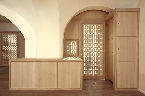 Eine Neustrukturierung und Klärung der Räumlichkeiten der Gemeinde wünschte sich die Lutherische Stadtkirche in der Dorotheergasse. Das in Wien und Aachen ansässige Bühro huhs & hanenberg stattete die gewölbten Räume eines säkularisierten Klarissinnen-Klosters aus dem 16. Jahrhundert mit einer differenzierten Lichtregie und einem "Rückgrat" in Form eines durchgehenden Möbelbandes aus, das viele Funktionen von Garderobe bis Buffet aufnimmt.