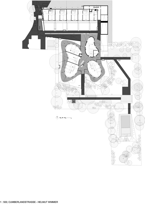 Den Rahmen gibt eine Parkanlage mit prachtvollem, altem Baumbestand vor, die sich nach Süden erstreckt. Erklärtes Ziel – so Wimmer – ist es, das Gebäude an den Baumbestand anzupassen, einen „Tanz mit den Bäumen“ zu wagen, um den Charakter des Parks zu erhalten: „Die Baukörper wiegen sich im Takt mit den Bäumen, sie schmiegen sich an, sie weichen zurück, sie drehen sich.“