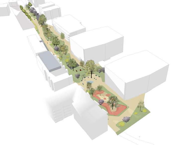 Die von Maria Auböck und János Kárász entworfene Anlage bietet sowohl den Bewohnern der geförderten neuen Wohnbauten als auch Anrainern und Besuchern einen durchgängigen Außenraum. Dieser verbindende Grünraum – finanziert von sechs verschiedenen Bauunternehmern und Genossenschaften – dient als Treffpunkt und Freizeitbereich für Kinder und Erwachsene.