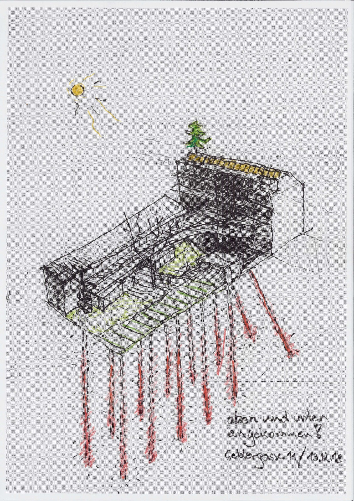 Die weitgehend auf Solar- und Geothermieenergie basierende Wärme- und Stromversorgung wird schrittweise für einen gesamten Häuserblock umgesetzt. Die Sonnenwärme wird im Sommer im Erdreich in bis zu 100 m Tiefe eingelagert und im Winter zum Heizen und für das Warmwasser verwendet. Im Sommer wird das Energieniveau des Erdreichs über den Rücklauf des Ladekreislaufs zur nachhaltigen Temperierung der Wohnungen genutzt. Die zwei gründerzeitlichen Vorstadthäuser, erbaut um 1865, werden aufgestockt und mit Dachgeschossen ausgebaut. Der Wohnraum wird generell um Balkone, Terrassen und Laubengänge ergänzt. Im Hofbereich werden Mietergärten und Gemeinschaftsräume angelegt. In angrenzenden Feuermauern, werden in nachbarschaftlicher Kooperation schrittweise französische Fenster zum zentralen Grün hin geöffnet und Balkone über Liegenschaftsgrenzen hinweg errichtet. Eine thermische Sanierung der Gebäudehüllen wird umgesetzt.