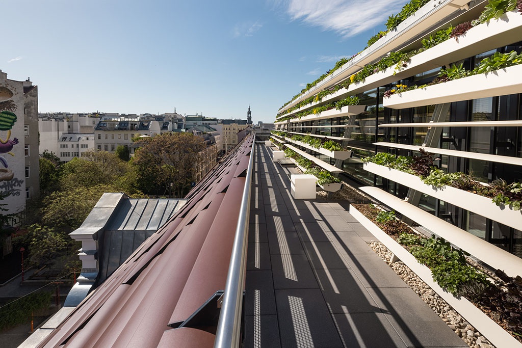 Beim Dachausbau in der Andreasgasse von RATAPLAN Architekten wurde die Substanz des Altbaus freigelegt und zu einem Raum ergänzt, bei dem die Vegetation dem Anorganischen gleichberechtigt ist, eine Dachhaut aus Pflanztrögen bildet zusammen mit dem Sonnenschutz eine „weiche“ und dezente Schicht als oberen Dachabschluss, die nach innen als Filter wirkt. All diese Maßnahmen leisten als „grüne Insel am Park“ einen Beitrag zur Stadtkühlung in dicht bebautem Umfeld. In Zeiten permanenter Dürresommer ein vorausschauender Ansatz der Integration von Grün und Architektur, die über reines Beranken und Kaschieren hinausgeht.