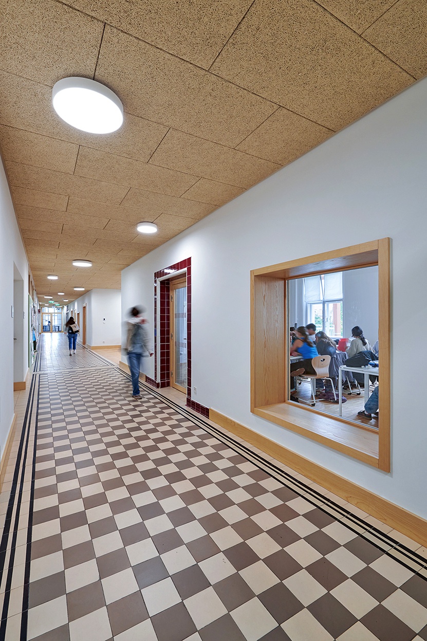 Die Adaptierung des Gebäudes innerhalb der Denkmalschutzvorgaben bot die Chance, Schulbaunormen zu hinterfragen und davon teilweise abzuweichen. So ergeben sich bei der vorhandenen Trakttiefe von fünf Metern Klassenzimmer, die schmäler, aber auch länger sind als üblich. Das bietet Platz für individuelles Lernen, Gruppenarbeiten und eine Garderobe. Die Architekt*innen entfernten Zwischenwände und öffneten die dunklen Mittelgänge zu den Unterrichtsräumen. Zwischen den Klassen entstanden offene Pausen- und Lernzonen. In den Gängen blieben die charakteristischen roten Fliesen der Sockelleisten und Türrahmen teilweise im Original erhalten – im gesamten Gebäude werden diese vorhandenen Elemente in den architektonischen Ergänzungen zitiert.