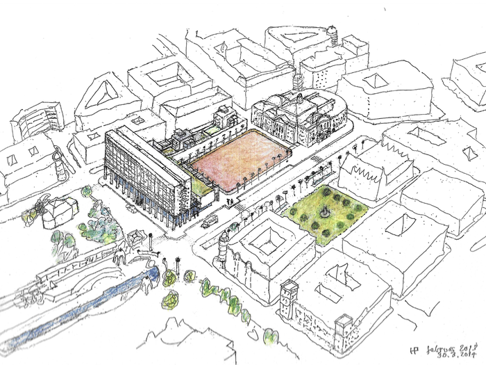 Das Gutachten war unter anderem zu dem Schluss gekommen, dass eine Neubebauung auf dem Areal keinesfalls höher als die Bestandsgebäude sein solle. Ein Resümee, das in der durch die Stadt Wien 2013 veröffentlichten Version gestrichen und bekanntlich in der Folge ebenso wenig beachtet wurde, wie die gleichlautenden Vorgaben der UNESCO. In seinem Alternativprojekt „in eigenem Auftrag“, das sich an dem Raumprogramm orientiert, das auch dem geladenen, privaten Wettbewerb des Investors zugrunde gelegt wurde, konnte Hans Puchhammer den Beweis antreten, dass ein wirtschaftlich tragfähiges Projekt in einer welterbekonformen Volumetrie machbar ist. Das Projekt geht aber weit über Fragen der Dimensionierung der Baukörper hinaus. Es enthält gerade auf der Ebene der konkreten Bezüge zum Bestand auf und am Grundstück selbst eine Reihe relevanter Vorschläge, die Probleme in nachhaltiger, integrativer und eleganter Weise lösen, die in den von den Projektbetreibern entwickelten Projektvarianten bisher unbeachtet und ungelöst geblieben sind. Der Bestand erhält bei Hans Puchhammer auf allen Maßstabsebenen eine tragende Rolle in der Entwicklung des Alternativprojekts.